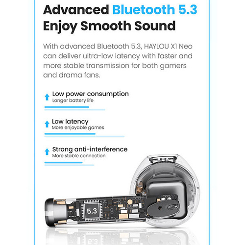 طراحی ایرفون های هندزفری بلوتوث Haylou X1 Neo به صورتSemi In-Ear است که به شکل کامل درون گوش جای می‌گیرند و به محض اینکه آن‌ها را درون گوش خود می‌کذارید، کم شدن نویز و صداهای اضافی محیط را متوجه می‌شوید. وزن 3.87 گرمی هر هندزفری را نیز در نظر بگیرید که در مجموع باعث شده تا در طولانی مدت امکان استفاده از آن را داشته باشید و کمتر خسته شوید. هندزفری هایلو X1 Neo دارای قابلیت تاخیر کم بوده که این هندزفری را برای بازی کردن و فیلم دیدن مناسب‌تر می‌سازد. برای فعال سازی این حالت کافی است پنل لمسی هندزفری سمت راست را لمس کرده و به مدت 3 ثانیه نگه دارید. هندزفری هایلو X1 Neo دارای بلوتوث نسخه 5.3 است. با استفاده از این هندزفری می توان تا فاصله ده متری (بدون هیچ مانعی) بدون افت کیفیت به موسیقی گوش داد. از دیگر قابلیت‌های بلوتوث نسخه 5.3 اتصال پایدارتر است. اگر گوشی شما نیز دارای نسخه 5.3 بلوتوث باشد، باتری استفاده شده از هندزفری و گوشی، کمتر خواهد بود. این ویژگی تنها زمانی رخ خواهد داد که گوشی نیز دارای نسخه 5.3 بلوتوث باشد. بر روی هندزفری X1 Neo ، پنل‌های لمسی قرار داده شده است که با لمس کردن این پنل‌ها می‌توانید کاربردهای مختلفی را که هایلو برای شما در نظر گرفته است انجام داده و در کل کاربری راحت‌تری داشته باشید. پخش و قطع موسیقی: یک بار ضربه به یکی از پنل‌های لمسی پاسخ به تماس یا قطع کردن: یک بار ضربه به یکی از پنل‌های لمسی زدن موسیقی به ترک بعد: 2 بار ضربه به پنل لمسی سمت راست زدن موسیقی به ترک قبل: 2 بار ضربه به پنل‌ لمسی سمت چپ رد تماس: دو بار ضربه به یکی از پنل‌های لمسی فعال کردن حالت تاخیر کم: 3 بار ضربه به پنل لمسی گوشی سمت راست داک شارژ هندزفری بلوتوث Haylou X1 Neo دارای باتری با ظرفیت 310 میلی آمپر ساعت است. میزان شارژدهی برای ایرفون های این هندزفری جهت شنیدن موسیقی 5 ساعت و حدود 30 ساعت در مجموع با داک شارژر می‌رسد.باید توجه داشت که این میزان از شارژدهی با در نظر گرفتن شرایط آزمایشگاهی مورد سنجش قرار گرفته، بنابراین ممکن است که در شرایطی که شما از هندزفری استفاده می‌کنید، این اعداد کمی متفاوت باشد. شارژ هندزفری نیز بوسیله پورت تایپ سی موجود روی بدنه آن انجام می‌شود. به محض باز کردن درب کیس هایلو X1 Neo هندزفری به آخرین دستگاهی که متصل بوده، وصل می‌شود.
