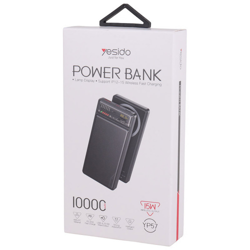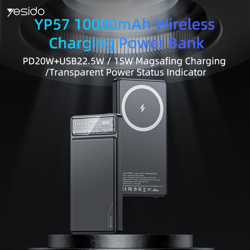 شارژر همراه یسیدو مدل YP57 با ظرفیت 10000 میلی آمپر ساعت محصولی از کارخانه یسیدو است. این محصول مجهز به سه عدد خروجی شامل یک عدد درگاه تایپ سی (مشترک)، یک عدد پورت USB و یک عدد پد شارژ وایرلس مناسب آیفون سری 12 الی 15 است.این پاوربانک مجهز به پشتیبانی از شارژ سریع QC3.0 و فناوری PD، درگاه USB دارای حداکثر توان خروجی 22.5 وات و درگاه Type-C دارای حداکثر توان 20 وات است.توان خروجی پد وایرلس معادل با 5، 7.5، 10 و 15 وات، جریان خروجی در صورت استفاده همزمان معادل 3 آمپر در 5 ولت است.بدنه ساخته شده از جنس پلاستیک ABS، امکان روشن و خاموش کردن پاوربانک توسط کلید فیزیکی روی بدنه است. دارای نمایشگر و نشانگر LED است. بهره مند از یک عدد درگاه ورودی Type-C (مشترک) و کابل تایپ سی به منظور شارژ کردن پاوربانک است.دارای باتری پلیمری با ظرفیت اسمی 10000 میلی آمپر ساعت، دارای قابلیت استفاده در هواپیما است.