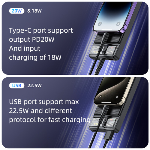 مشخصات فنیپشتیبانی از شارژ سریع QC3.0 و فناوری PD، درگاه USB دارای حداکثر توان خروجی 22.5 وات و درگاه Type-C دارای حداکثر توان 20 وات مجهز به سه عدد خروجی شامل یک عدد درگاه تایپ سی (مشترک)، یک عدد پورت USB و یک عدد پد شارژ وایرلس مناسب آیفون سری 12 الی 15