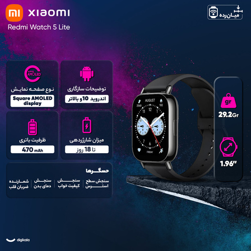 ساعت هوشمند شیائومی مدل Redmi Watch 5 Lite، ترکیبی هوشمندانه از طراحی مدرن، امکانات کاربردی و قیمت مناسب است که برای استفاده روزمره و ورزشی آقایان و بانوان طراحی شده است. این ساعت با سیستمعامل Xiaomi HyperOS و بلوتوث نسخه 5.3، تجربهای روان و سریع از اتصال به گوشیهای اندروید 8 و iOS 12 به بالا را فراهم میکند. یکی از ویژگیهای برجسته آن، قابلیت مکالمه از طریق بلوتوث است که به شما اجازه میدهد تا بدون نیاز به بیرون آوردن گوشی، تماسهای خود را پاسخ بدهید. صفحه نمایش AMOLED مربعی 1.96 اینچی با وضوح 410×502 پیکسل و تراکم 332 پیکسل بر اینچ، تصویری شفاف و رنگهایی زنده به نمایش میگذارد. بدنه سبک 29.2 گرمی و بند سیلیکونی قابل تعویض، راحتی بیشتری را هنگام استفاده در فعالیتهای روزانه یا ورزشی به همراه دارد. همچنین این ساعت با مقاومت در برابر آب تا عمق 50 متر و فناوریهای GNSS مانند GPS، Glonass و BeiDou، گزینهای مناسب برای ورزشکاران و علاقهمندان به تمرین در فضای باز است. باتری 470 میلیآمپری آن نیز تا 18 روز شارژدهی را در استفاده معمولی تضمین میکند. این ساعت، همراهی هوشمند و شایسته برای زندگی پرتحرک امروز است.